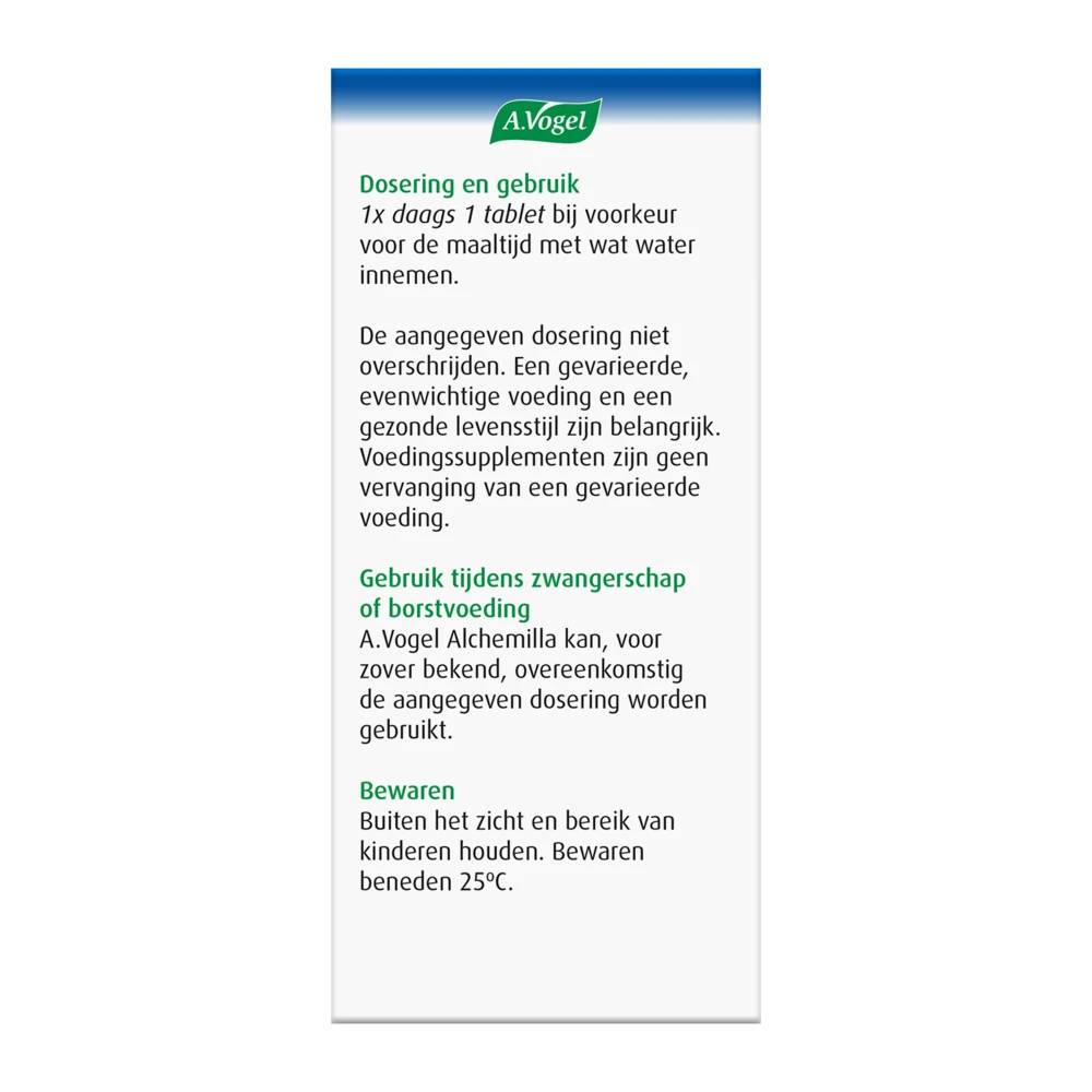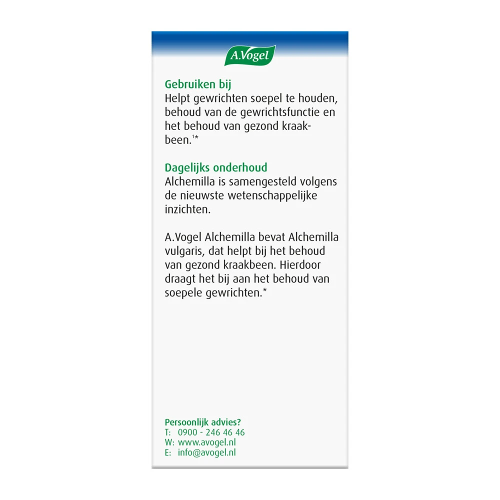 A.Vogel Alchemilla Gewrichten1* TablettenAlchemilla Gewrichten1* tabletten van A.Vogel is een voedingssupplement op basis van Alchemilla vulgaris*. Alchemilla helpt om gewrichten1* soepel te houden. Alchemilla vulgaris is voor het behoud van gezond kraakbeen en het helpt gewrichten soepel te houden.1*Voor het dagelijks onderhoud van soepele gewrichten1*Voor het het behoud van gezond kraakbeen1*Slechts 1 tablet per dag 1 = Alchemilla vulgaris. *Gezondheidsclaim van Alchemilla vulgaris i