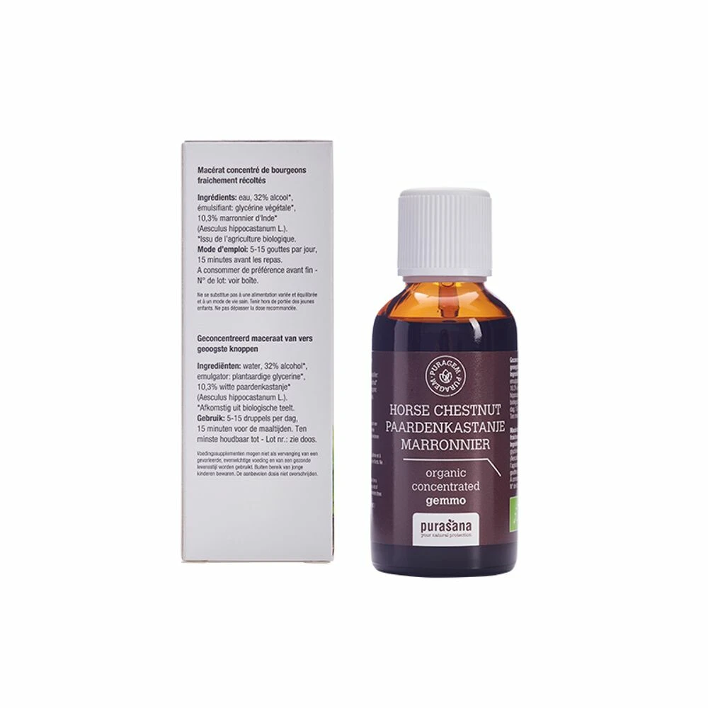 Purasana Puragem Paardenkastanje BioPurasana Puragem Paardenkastanje Bio is gemaakt van de vruchten en bloemen van de witte paardenkastanje (Aesculus hippocastanum) en bevat de stof aescine. Dit is een stof die de circulatie in het lichaam ondersteunt. Puragam Paardenkastanje ondersteunt de bloedcirculatie en helpt zo zware en vermoeide benen te verlichten. Ook ondersteunt het de bloedsomloop, de aderen en haarvaten. Tot slot draagt het bij aan soepele gewrichten.Ondersteunt de bloedsomloopVerli