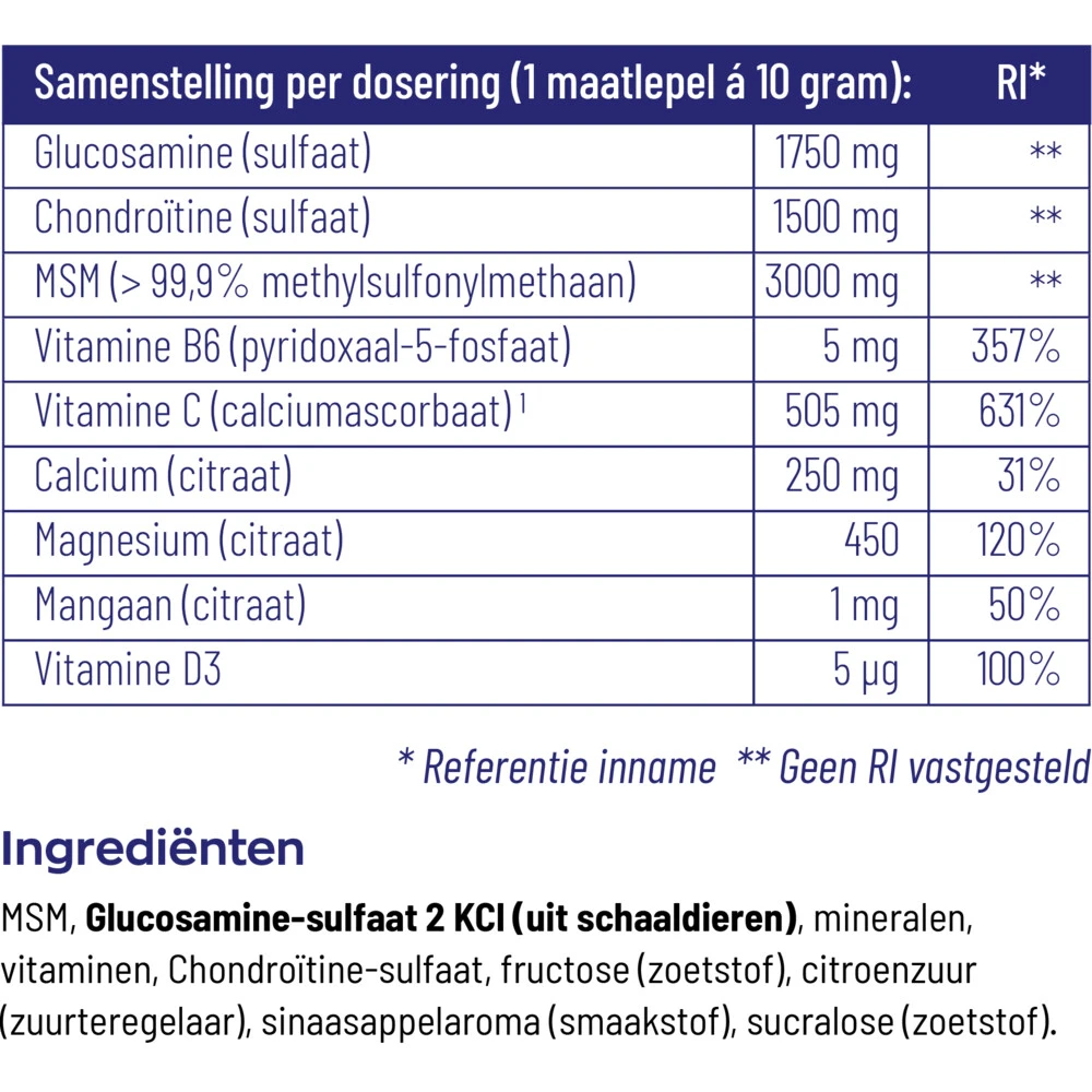 Vitakruid Atrimove GranulaatDit duo pack van Vitakruid Atrimove is een formule die het behoud van gezonde botten, spieren en gewrichten ondersteunt. Atrimove Granulaat bevat glucosamine, Chondroïtine-sulfaat, Magnesium, Mangaan, vitamine C, vitamine B6 en vitamine D.Extreem hoge dagdoseringen van de actieve nutriënten: Glucosamine (1750 mg), Chondroïtine (1500 mg) en MSM (3000 mg).Twee ondersteunende nutriënten voor de vorming van bindweefsel en collageen: Mangaan en vitamine